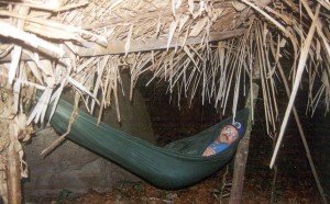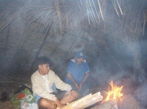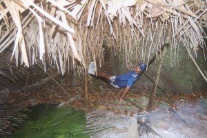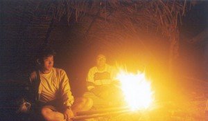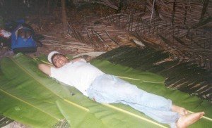 ในที่สุดท้องฟ้าก็มืดสนิทเสียงแมลงร้องระงมป่า พร้อมกับเสียงสัตว์ป่ากลางคืนก็เริ่มส่งเสียงออกหากิน สังเกตุได้จากจะได้ยินเสียงสัตว์กระโดดตามยอดไม้ พวกเราก็คุยกันไปเรื่อยๆ จนต่างคนก็แยกย้ายกันนอน ผมเดินดูสถานที่พักอีกรอบเพื่อดูความปลอดภัยแล้วก็มานอนในเปลสนาม ตาก็มองไปบนท้องฟ้าที่เห็นดาวต่างๆ ตามช่องว่างของกิ่งไม้ที่ขึ้นอยู่หนาทึบงีบหลับไป ช่วงราวๆ เที่ยงคืนอากาศหนาวจัดมาก ผมสะดุ้งตื่นขึ้นมาได้ยินเสียงก๋องแก็ก พยามเงี่ยหูฟังว่าเป็นเสียงอะไร แล้วเปิดผ้าใบที่เอาคลุมหน้าไว้ออกมาดู เห็นคุณแซมปัทกำลังลากฟืนมาสุมไฟ ซึ่งตอนนี้มอดไปเยอะแล้ว ผมลุกขึ้นมาช่วยแก คุณแซมปัทบอกว่าแทบไม่ได้นอนเลย และก็นอนไม่หลับเพราะว่ากลัว (ปกติแล้วคนที่ไม่เคยนอนในป่ากลางคืนก็จะกลัว