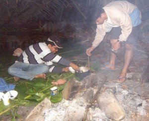 หลังจากนั้นก็ปลดสัมภาระเตรียมตั้งแคมป์บริเวณนี้ทันที โดยผมได้ลากหินจากห้วยมาทำเตาแบบสามเส้าและก่อไฟเพื่อใช้สำหรับหุงข้าวทำอาหาร ซึ่งทุกคนต่างก็หิวและก็เหนื่อยล้ากันมาก ส่วนคุณแซมปัทและพี่สุวีก็จัดแจงเตียมที่นอน โดยที่คุณแซมปัทนั้นได้เตรียมผูกเปลสำหรับนอนในคืนนี้ (เรื่องเปลนี่ผมเป็นคนบอกเองว่าเข้าป่า ถ้าจะให้นอนสบายไม่มีแมลงมารบกวนดีที่สุดคือผูกแปลนอน แต่ทว่าลืมบอกแกว่าในป่าดิบต้องใช้เปลผ้าใบสนามซึ่งสร้างความอบอุ่นได้ดีอย่างที่ทหารเขาใช้กัน แกไม่รู้เลยเอาเปลตะข่ายที่เอาไว้ผูกนอนตามชายหาดมา -*- ซึ่งความหนาวเย็นในป่า และก็น้ำค้างแรงขนาดนั้นถ้าใช้เปลตาข่ายไม่มีทางนอนหลับได้อย่างแน่)